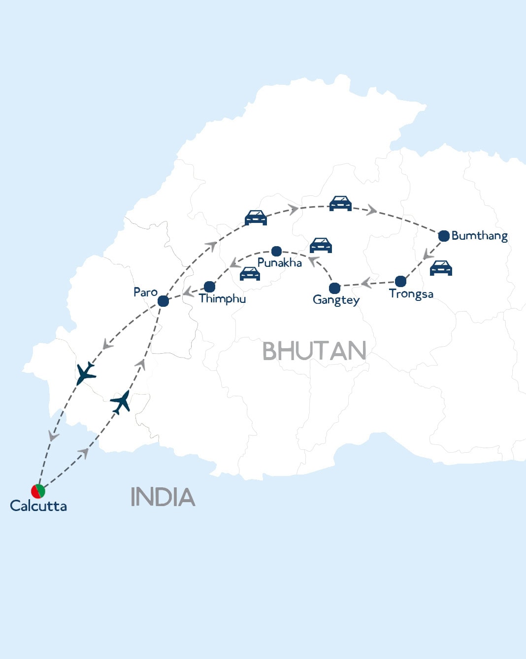 Itinerary: Europe - Calcutta - Paro - Vallées du Bumthang - Trongsa - Gangtey - Punakha - Timphu - Paro - Calcutta - Europe