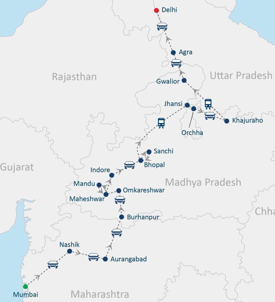 Itinerary: Mumbai - Nasik - Aurgangabad - Bhuranpur - Maheshwar - Bhopal - Orcha - Khajuraho -Gwalior - Agra – Delhi