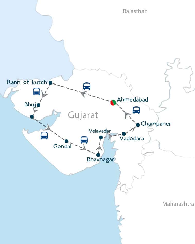 Itinerary: Ahmedabad - Rann of Kutch - Dholavira - Bhuj - Mandvi - Banni Villages - Gondal - Junagadh - Sasan Gir Reserve - Bhavnagar - Velavadar - Lothal - Vadodara - Chotta Udepur - Jambughoda - Champaner - Pavagadh - Ahmedabad